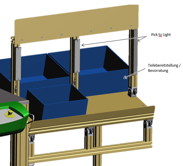 Eine Lichtschranke detektiert die Entnahme der Bauteile aus der entsprechenden Bevorratung und verifiziert die Montagereihenfolge. Das "durch das Licht greifen" wird dem Mitarbeitenden als optisches Signal angezeigt und vom System als Arbeitsschritt erkannt. Das System vergleicht den Arbeitsschritt mit der Montagereihenfolge.