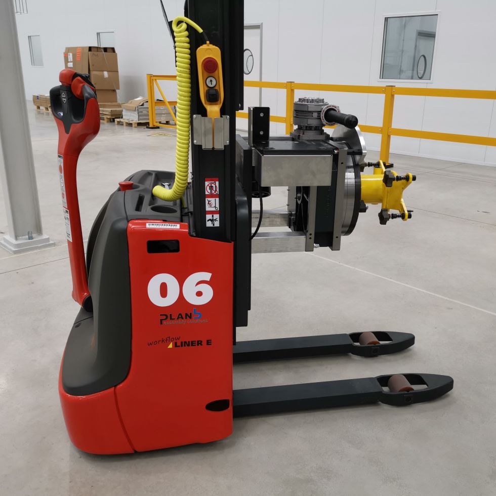 Die Beförderung des Getriebes erfolgt durch den Plan B Workflowliner™, durch den große und schwere Bauteile mit wenig Aufwand von einer Station zur nächsten befördert werden. Es handelt sich um speziell umgebaute Niederhubwagen, die eine flexibel anpassbare und somit ergonomische Montage ermöglichen.