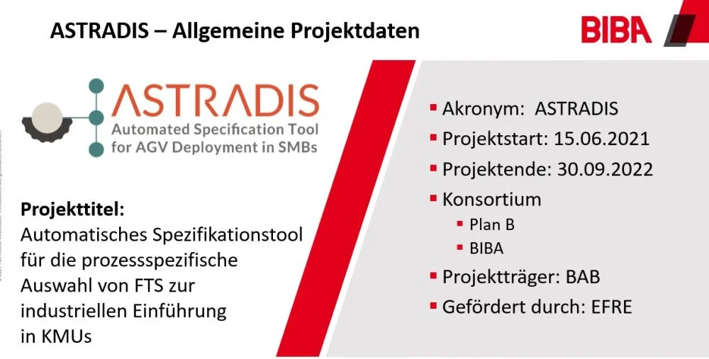 Kleine und mittelständische Unternehmen (KMU) stehen bei der Einführung problemspezifischer Lösungen, wie zum Beispiel bei der Optimierung intralogistischer Prozesse durch die Einführung von Fahrerlosen Transportfahrzeugen (FTF) häufig vor den Herausforderungen alle Information zu überblicken, Rahmenbedingungen richtig einzuordnen und damit letztlich wirtschaftliche Entscheidungen zu treffen. Genau hier setzt das von der Bremer Aufbaubank über den Europäischen Fond für regionale Entwicklung geförderte Forschungsprojekt ASTRADIS an.