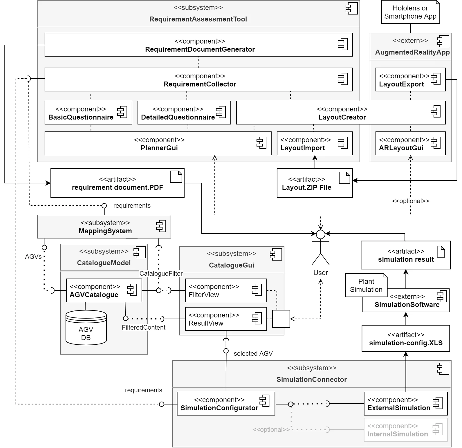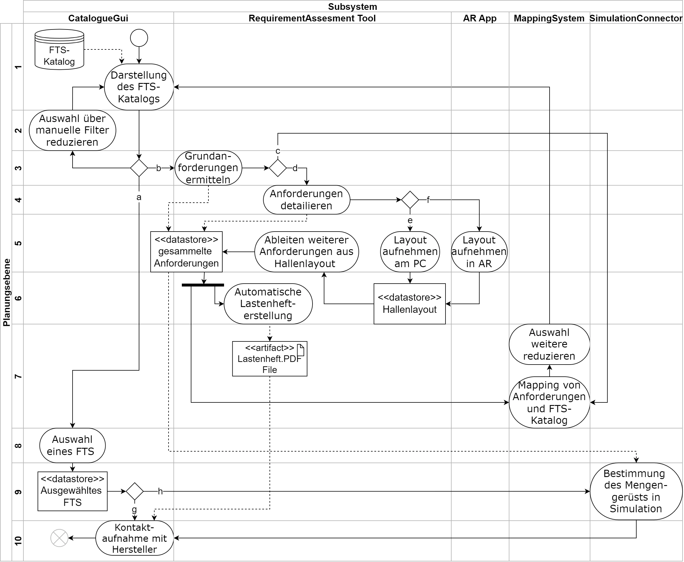 Alternativ besteht die Möglichkeit die Lösungsmenge der Fahrerlosen Transfahrzeuge durch die assistierte Anforderungsaufnahme programmgesteuert zu reduzieren. Diese baut auf einem Fragebogen auf, ist in der Anwendung jedoch wesentlich komfortabler und strukturierter als analoge Vorlagen. Zudem können die digitalisierten Daten über die Schnittstellen der Software direkt weiterverwendet werden. Auf dieser Basis ist ein fachlicher Austausch mit den Anbietern der FTF-Lösungen oder einem Systemintegrator für die weitere FTS-Planung möglich.