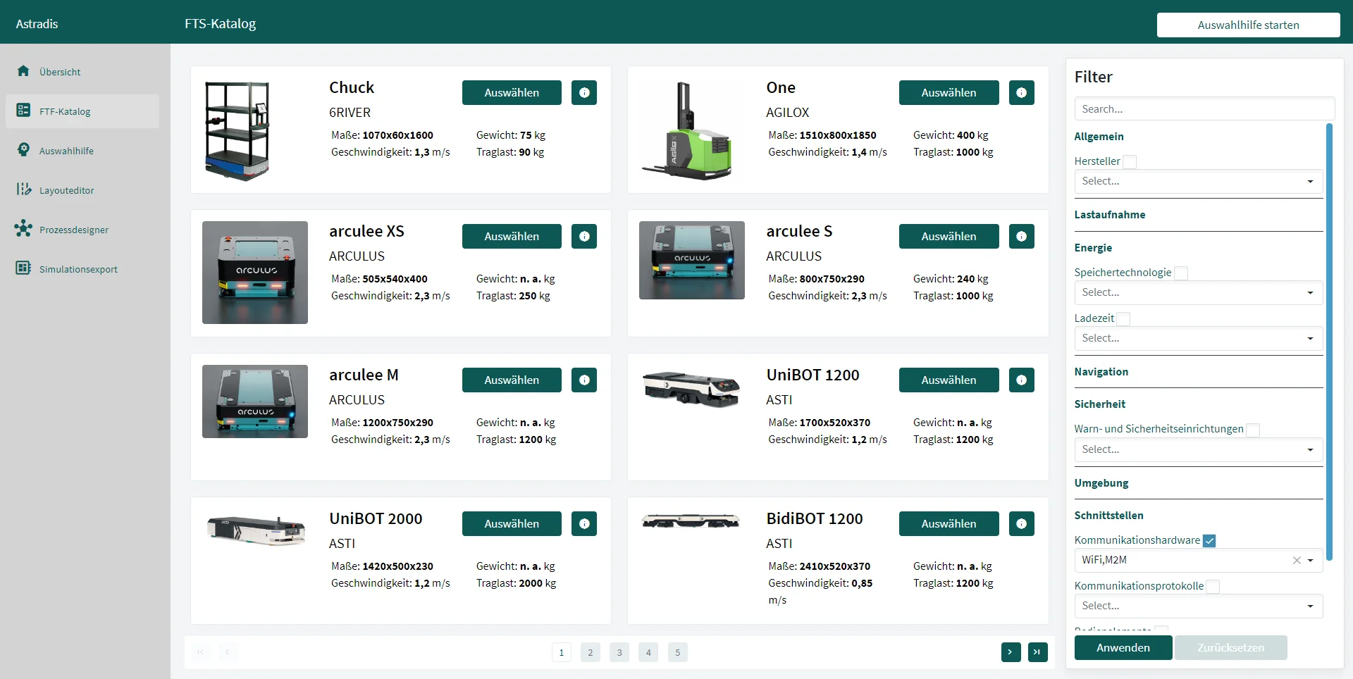 In einem ersten Schritt lässt sich der herstellerunabhängige FTF-Katalog durchsuchen. Die Lösungsmenge kann dabei durch manuelle Filter reduziert werden und nach Auswahl einer Lösung die Kontaktaufnahme mit dem entsprechenden Hersteller erfolgen. Bereits jetzt entsteht ein guter Überblick über die FTF-Typen, welche zur Aufgabe passen. Der Katalog fungiert damit auch als kontextbasierter Ideengeber. Aktuell umfasst der Katalog ca. 320 Fahrerlose Transportfahrzeuge und Transportsysteme (Stand 2022) diverser Hersteller.