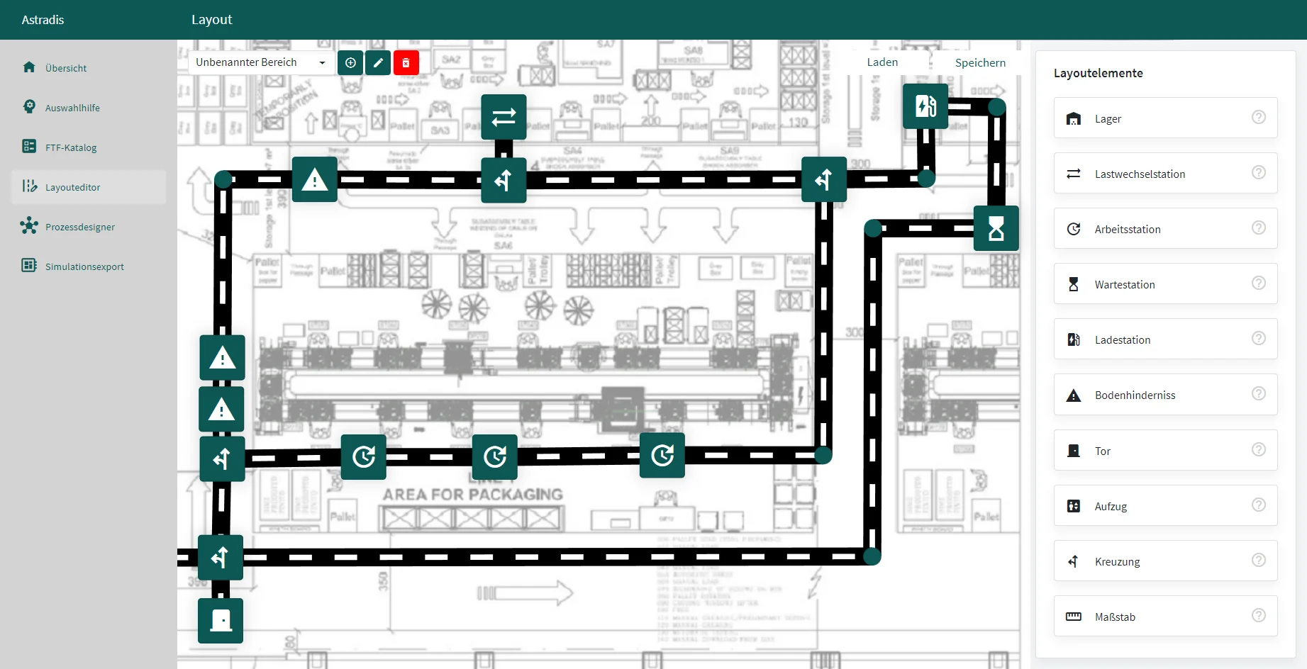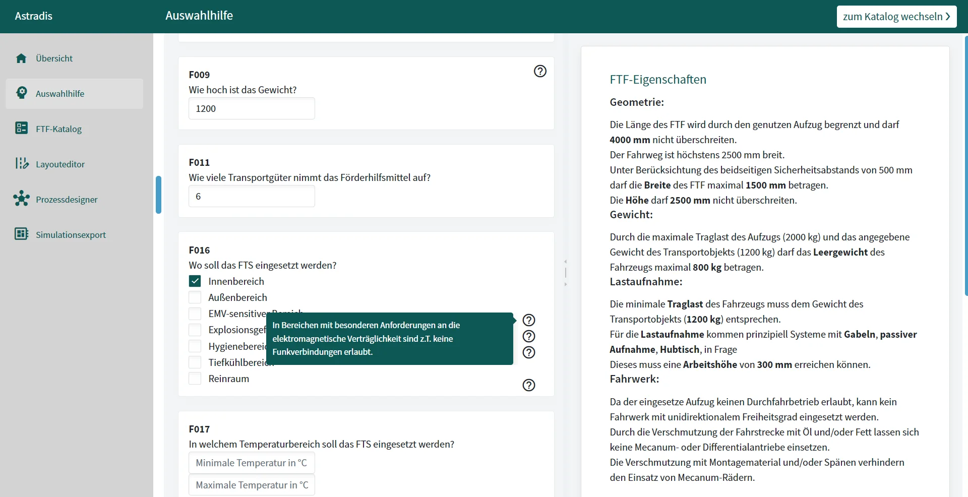 Die anwenderfreundliche Softwarelösung Astradis bietet die Möglichkeit ohne detailliertes Fachwissen oder Planungsexpertise im Bereich Fahrerloser Transportsysteme in das Thema einzusteigen. Der Nutzer wird mit der geführten Aufnahme durch den gesamten Planungsprozess zur FTF-Auswahl begleitet. Dabei stehen verschiedene Funktionalitäten, welche auch einzeln genutzt werden können, zur Verfügung.
