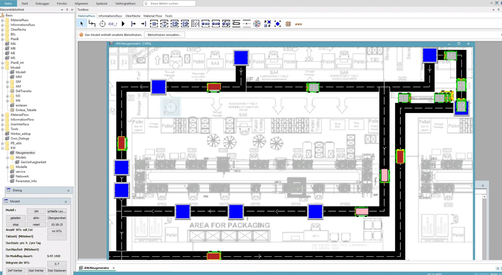 Durch die integrierte Schnittstelle zur Materialflusssimulation kann auf diese Datenlage aufbauend die FTS Planung durch die Simulation verifiziert und die Anzahl notwendiger Fahrerloser Transportfahrzeuge und damit das Mengengerüst für die Anfrage ermittelt werden.