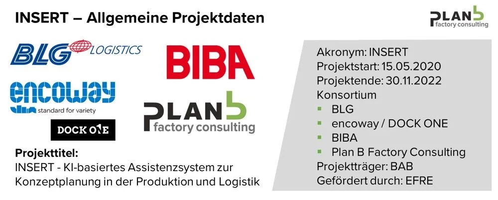 Ziel des von der EU finanziell geförderten Projekts INSERT ist die Entwicklung eines Assistenzsystems, welches unter Nutzung der künstlichen Intelligenz (KI), die Mitarbeitenden bei der Erstellung von Konzepten im Bereich der Logistik- und Produktionsplanung unterstützt.